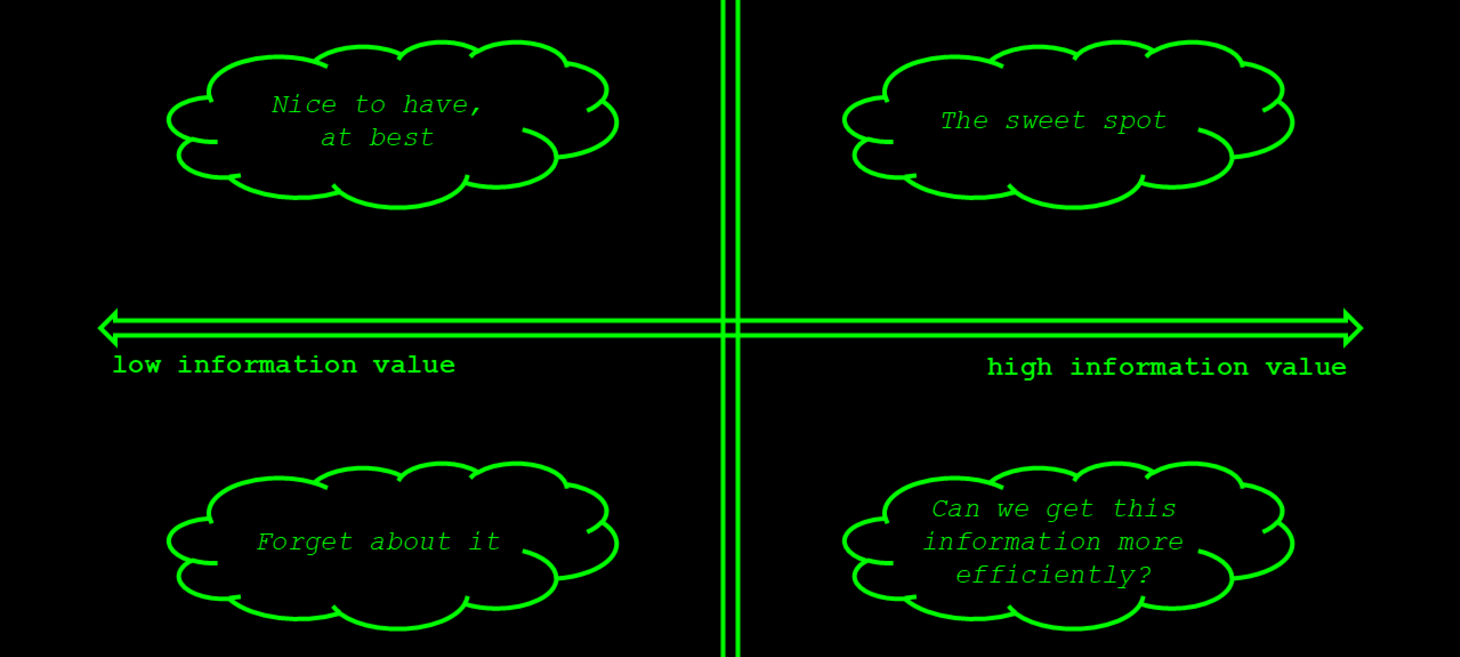 Dit samen levert een soort kosten-batenanalyse op. Je kunt bestaande geautomatiseerde testen op dit model leggen en kijken hoe efficiënt en informatief ze zijn. Het is dan uiteraard handig om testen meer in het kwadrant rechtsboven te krijgen.